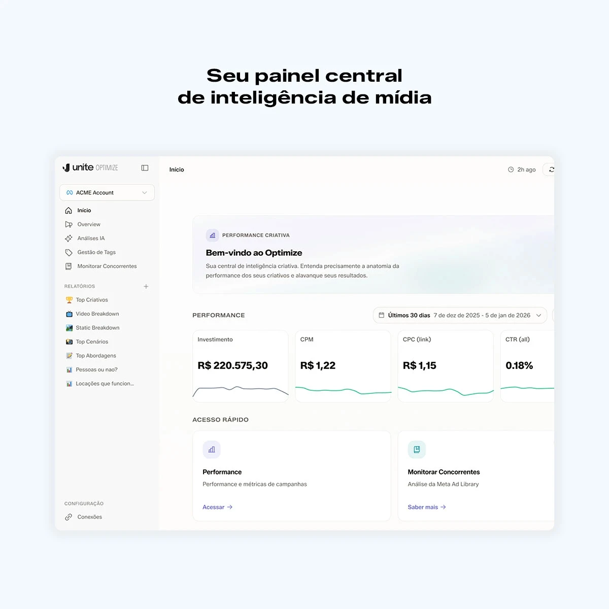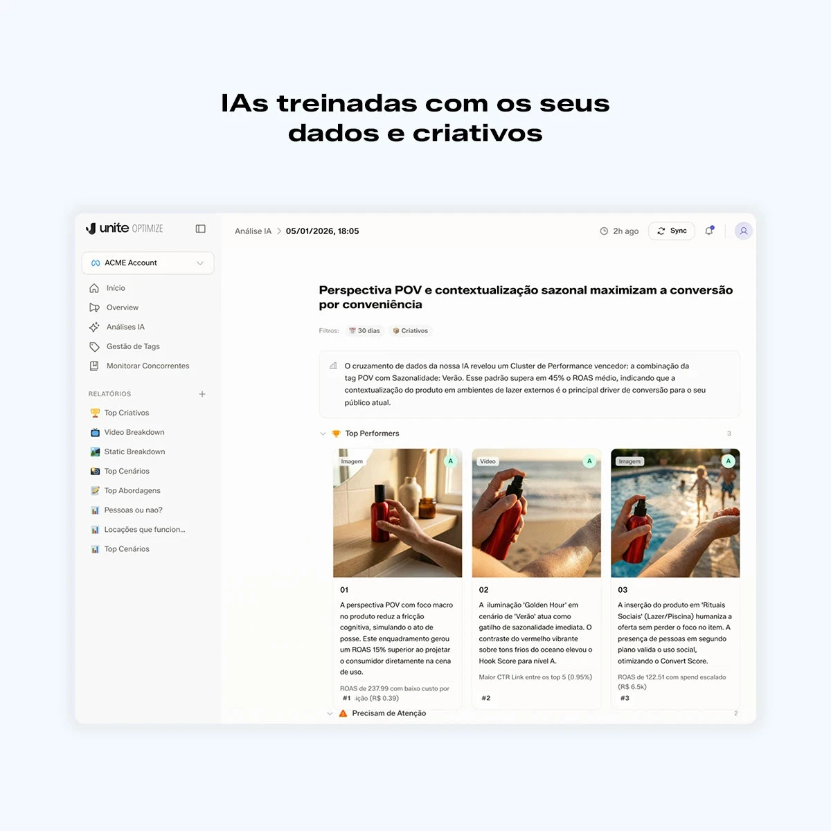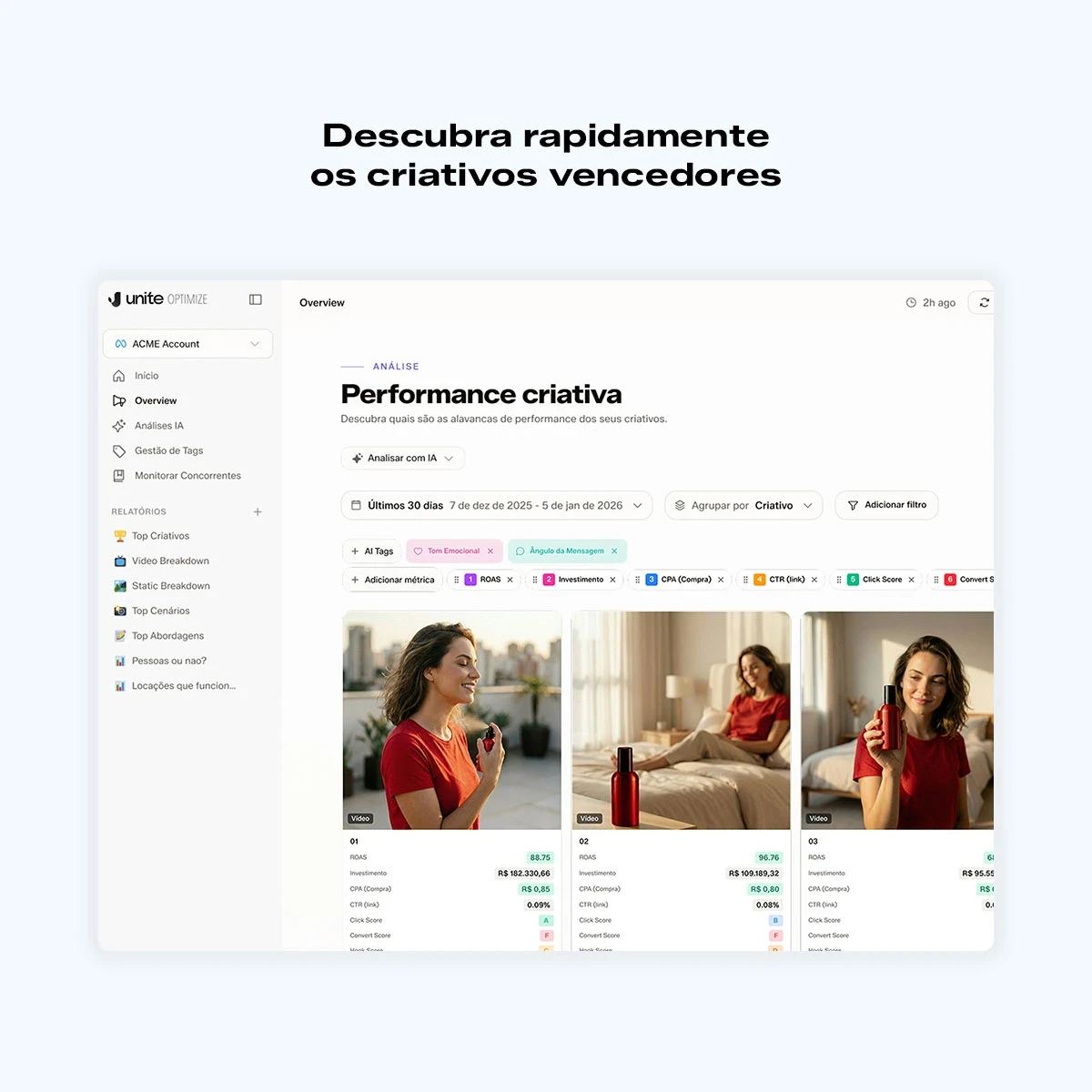 Unite Optimize é a IA que disseca os fatores criativos que fazem cada anúncio gerar resultados e direciona exatamente o que fazer para aumentar seu ROI.