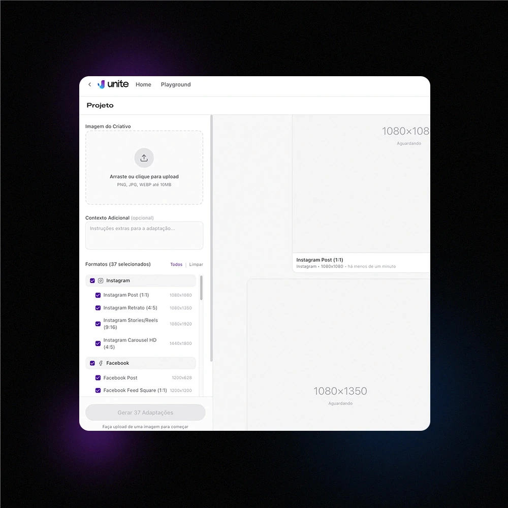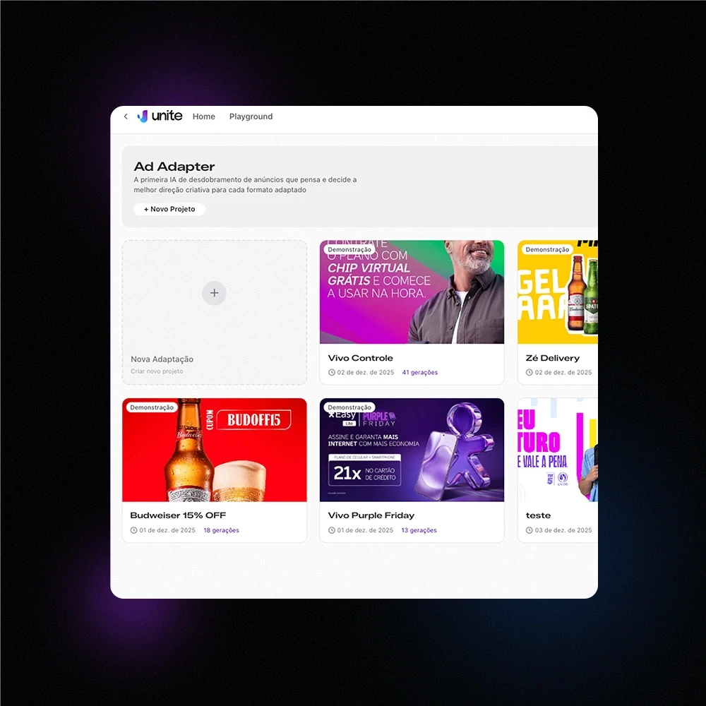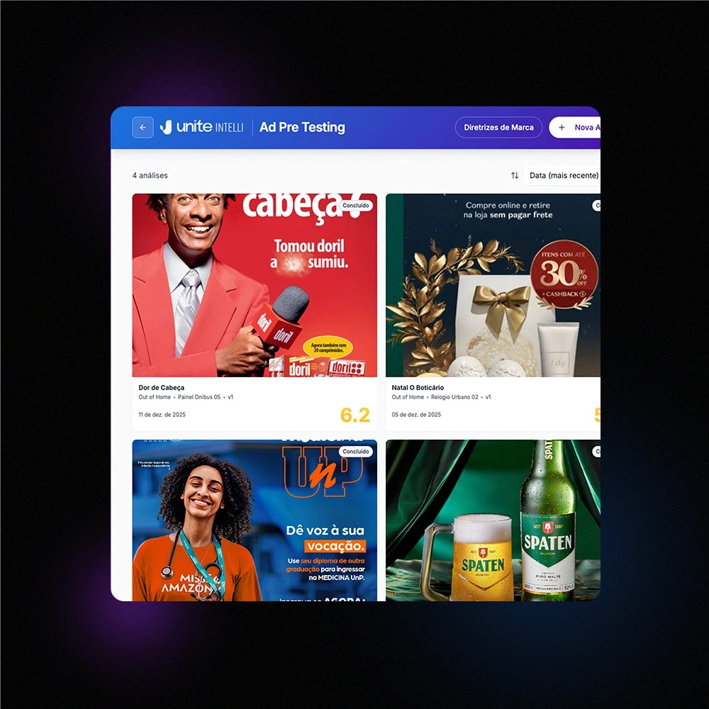 Da criação à performance, Unite é a plataforma de inteligência artificial que ajuda grandes marcas e agências a criar, desdobrar, pré-validar e otimizar campanhas com mais velocidade, consistência e resultados.