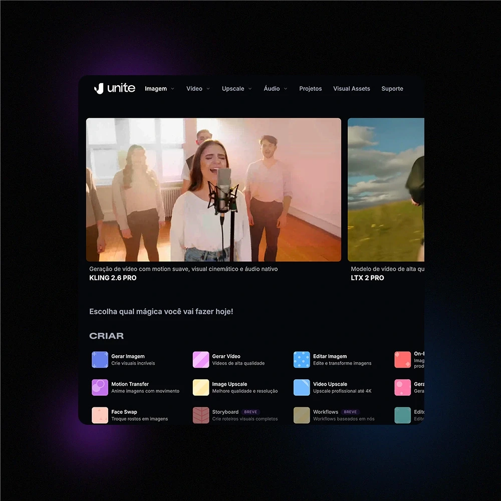 Hub com as melhores IAs de imagem, vídeo e áudio e recursos de consistência de marca